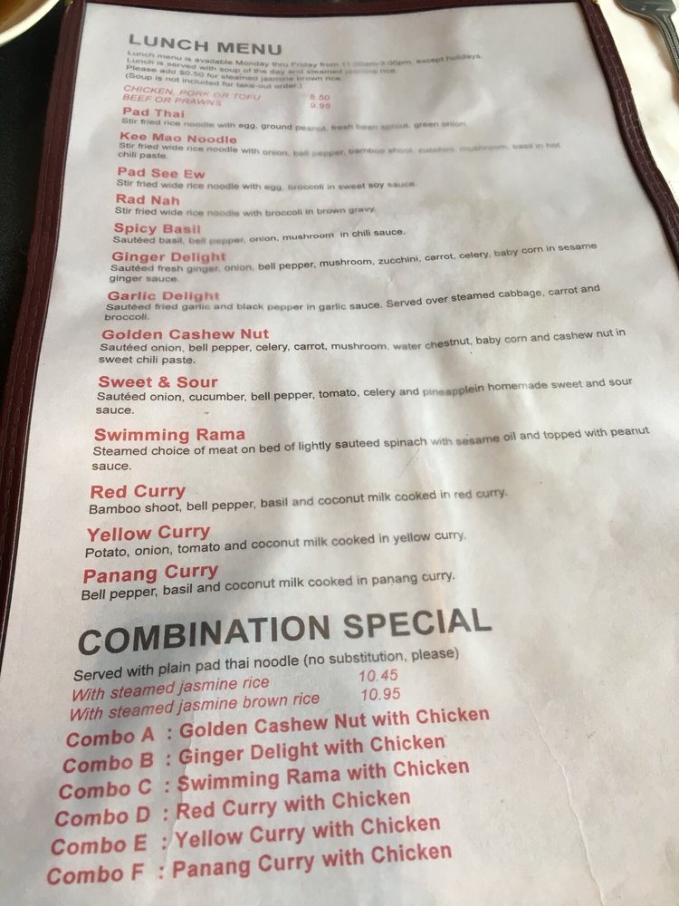 “ Had lunch on Saturday around 130230pm. Lot of seating available during that time. Service was excellent. Food was delicious. We ordered thai iced tea, stir fry lamb basil, golden cashew nut and chicken panang curry with jasmine rice. Everything was absolutely delicious. ”